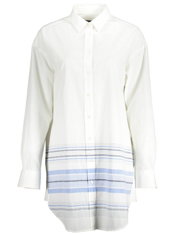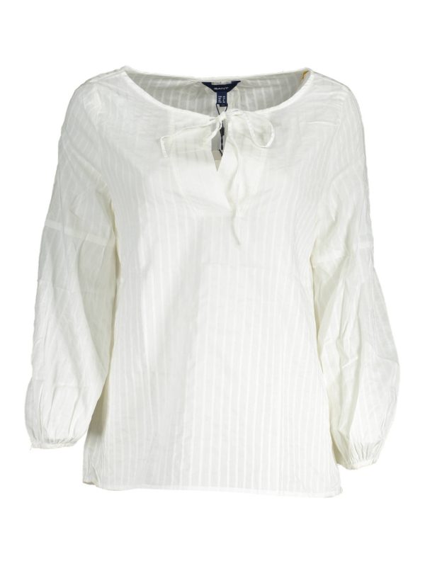 Bijela GANT košulja s dugim rukavima, izrađena od lagane pamučne tkanine s tankim vertikalnim prugama sa detaljem mašne na V-izrezu.